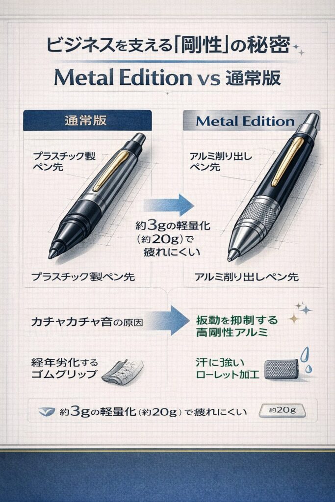 プラスチック製の多機能ペンは、筆記時にペン先が微細に振動する「ガタつき」が発生しやすく、カチャカチャというノック音が響きがちです。しかし、Metal Editionのアルミボディは剛性が極めて高く、この微細な振動を抑制します。