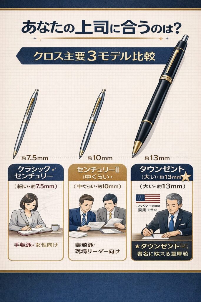 タウンゼントは、その重厚感ゆえに「リーダーのためのペン」として設計されており、実際にオバマ元大統領も愛用していました。 一方で、現場でメモを頻繁に取るような実務重視の方には、両者の中間的な太さである「センチュリーII」も選択肢に入りますが、昇進祝いとしての「格」を優先するならタウンゼント一択です。